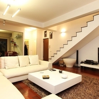 Primul nivel al duplexului te rasfata cu un living foarte spatios, unde fiecare colt este prilej de leneveala: canapele moi si albe dispuse in fata unui televizor, scaune confortabile separate intr-o zona in care sa fumezi sau sa-ti bei cafeaua sau un fotoliu confortabil aflat sub o veioza superba, locul perfect pentru a citi o carte.