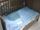 Patut copii, saltea cocos, aparatoare patut, perna, 3 cearceafuri si o jucarie de patut, aproape noi.