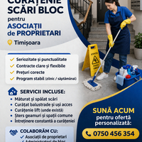 Servicii de Curatenie in Asociatii de Propietari Servicii de Curatenie in Asociatii de Propietari 🧼 Curățenie Scări Bloc pentru Asociații de Proprietari – Timișoara Oferim servicii profesionale de curățenie pentru scări de bloc dedicate asociațiilor de proprietari din Timișoara. ✔ Seriozitate și punctualitate ✔ Contracte clare și flexibile ✔ Prețuri corecte ✔ Program stabil (zilnic / să... 173111 400.00