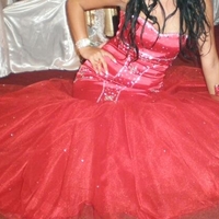 Vand urgent rochie de seara tip sirena , de culoare rosie, material saten lucios cu pietre albe si rosii cu tiul si crinolina